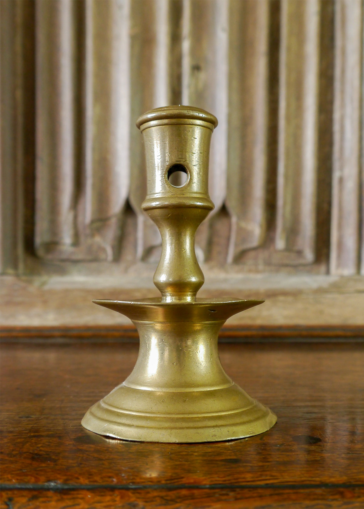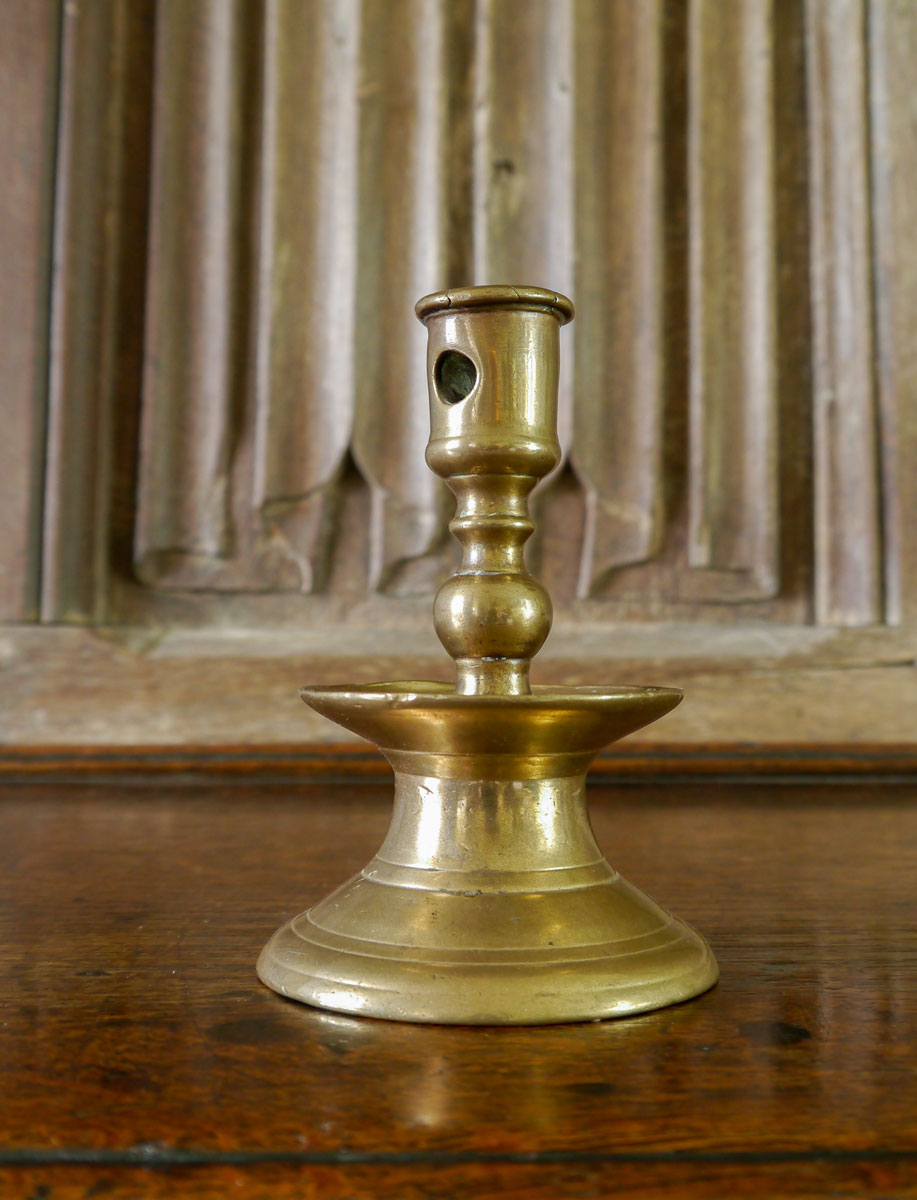 On the left, a late 16th century bronze candlestick, the simple socket, with circular piercing, above a short but quite complicated baluster shaft, which sits into the upward-curving drip pan. The bell-shaped base has ring-turned incised decoration.