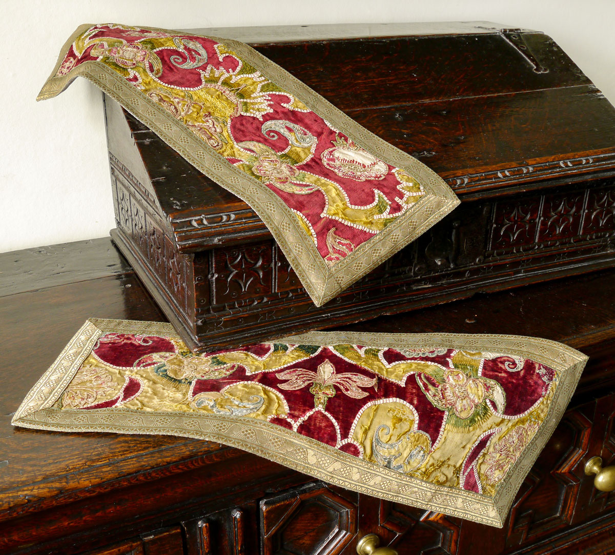 The red velvet ground, with green and gold silk appliqué, of a floral design. With linen backing and bordered with gold braid.