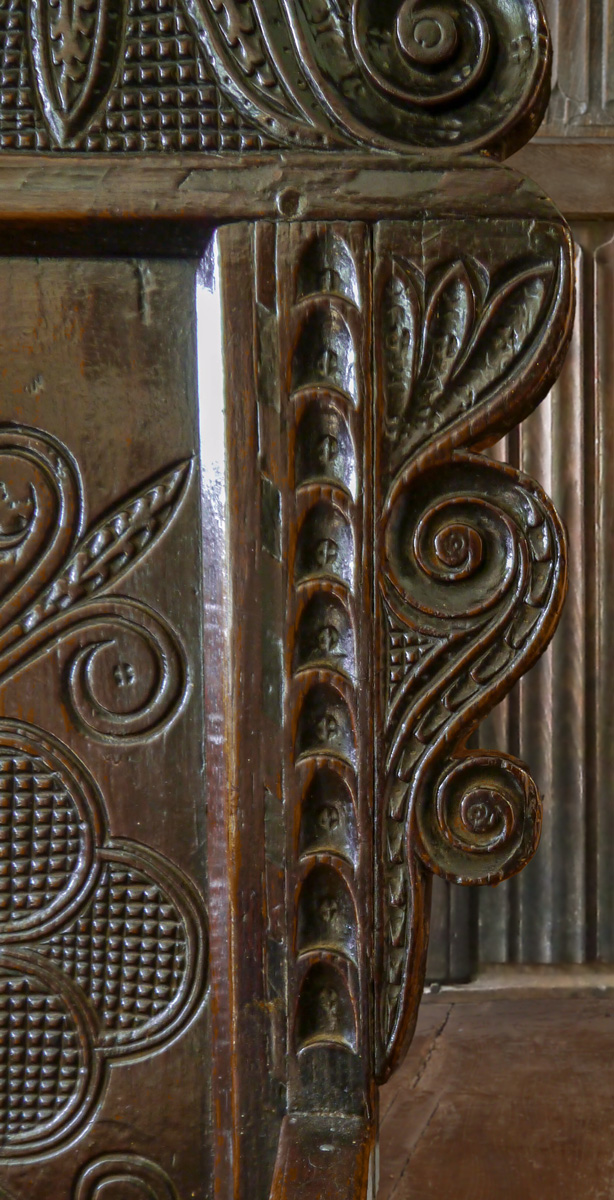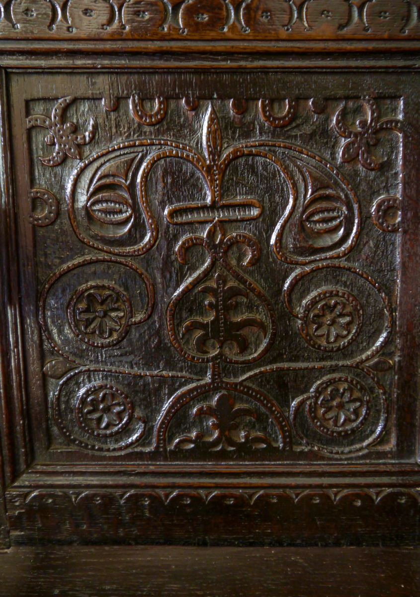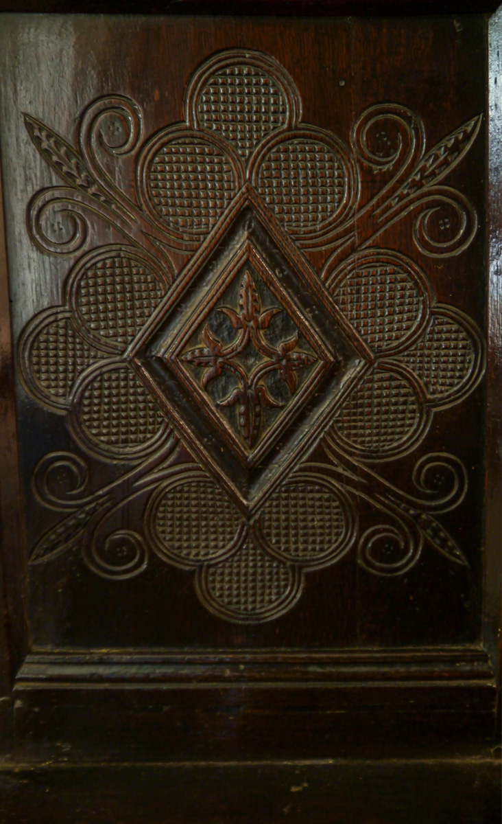 The tall flamboyant crest, with deeply carved scrolls, drooping leaves, a stylised fleur de lys, and precisely cut cross-hatching. Below the crest the single panel has a lozenge centre with four pendants pointing to the corners, and again the precise cross-hatching set in overlapping circles.