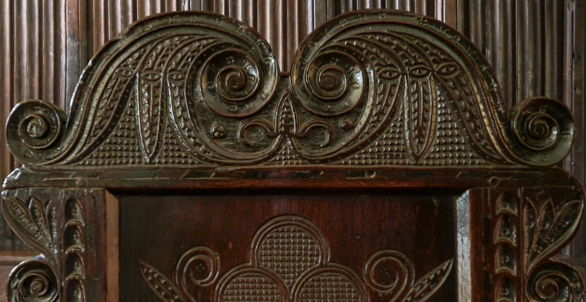 The upper panel of the two-panel back has a pair of birds facing a second pomegranate, whilst the lower panel has a stylised central tree of life with leaves and flowerheads. The frame of the back has carved decoration, with a line of punched embellishments running centrally down the arms.