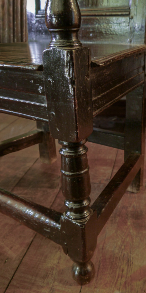 The down curved arms rest on bold turned supports, which continue below the single board seat to form the heavily turned legs, which are joined by equally heavy cross stretchers, and finish in a good turned foot, or “toe”.