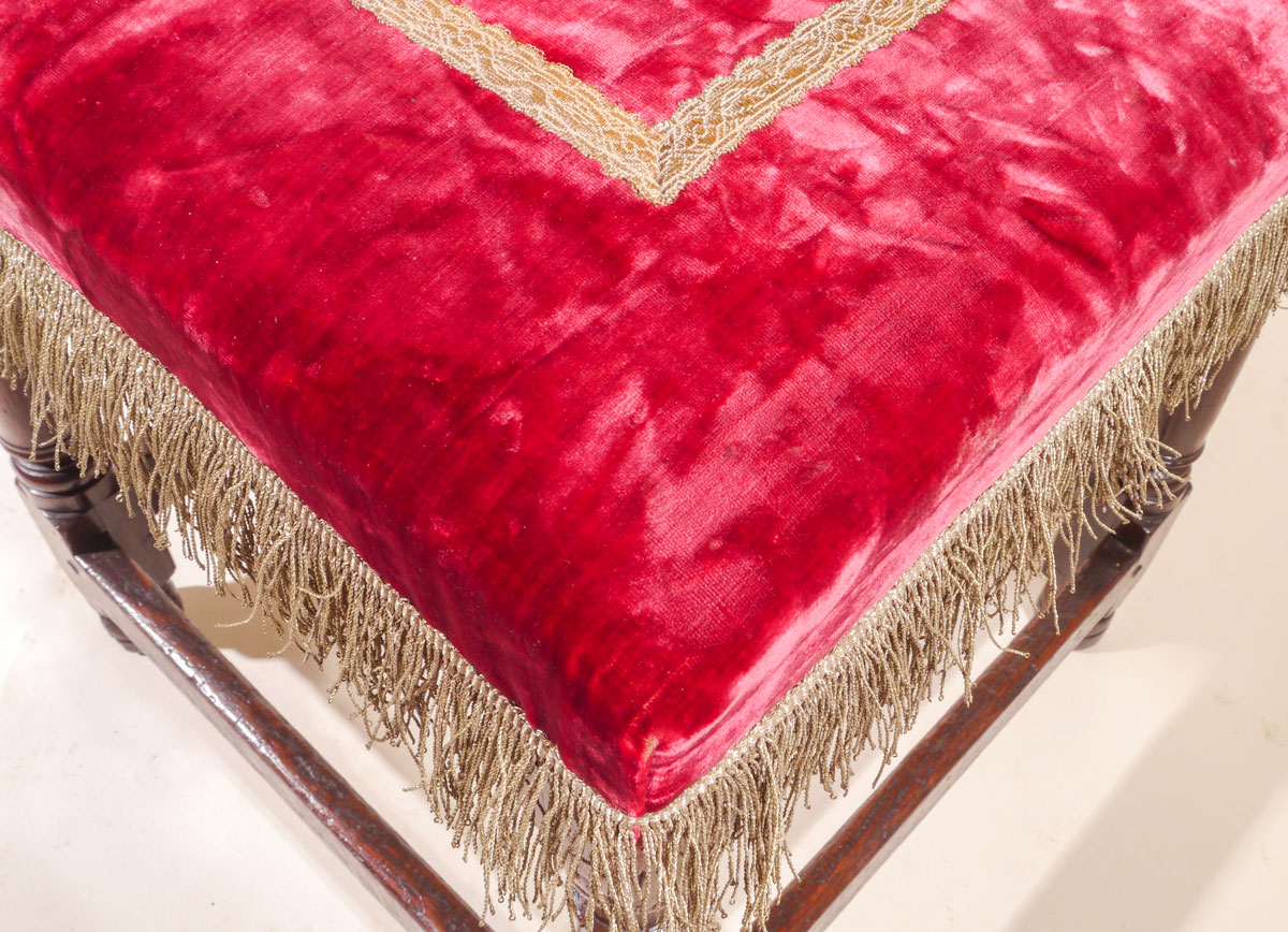 The well-turned columnar legs, with ring-turning at the top and bottom, joined by all round stretchers. The tops are upholstered in 18th century silk velvet and bullion thread braid.
