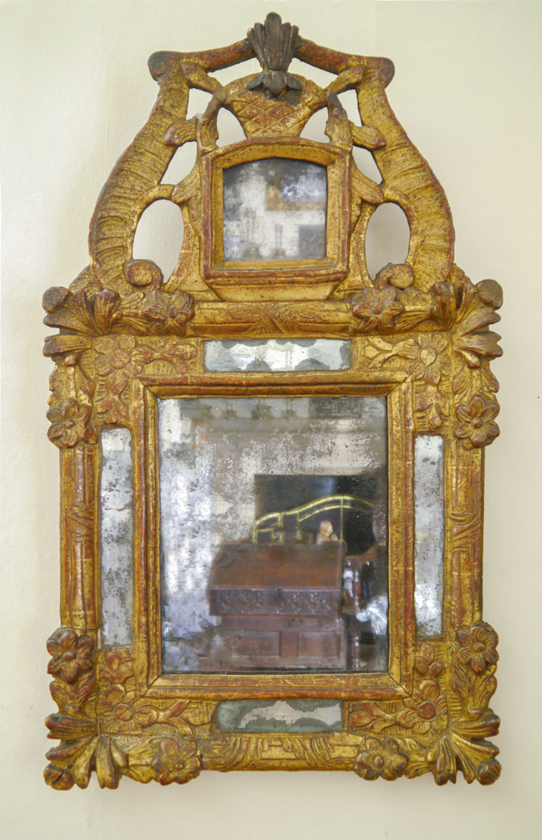 In beautiful original condition, this early 18th century mirror is set in a carved wood frame, of scrolls and stylised leaves, retaining the original gesso and gilt. The silvered mirrors are also original, as is the crest. This type of mirror nearly always had an upper crest, however many have been lost over the years, quite often to make the mirror smaller.