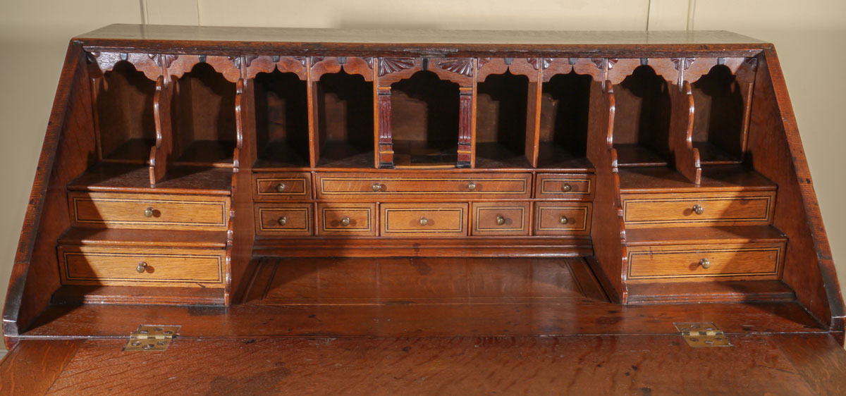 The single piece fall front, with an applied moulded bookrest, enclosing an outstanding fitted interior of pigeon holes, small drawers and a secret compartment, all decorated with line inlay and carved decoration, set around a central well. Applied to the top rail is a carved walnut festooned scallop shell, which sits above two short and three long drawers, again all decorated with line inlay.