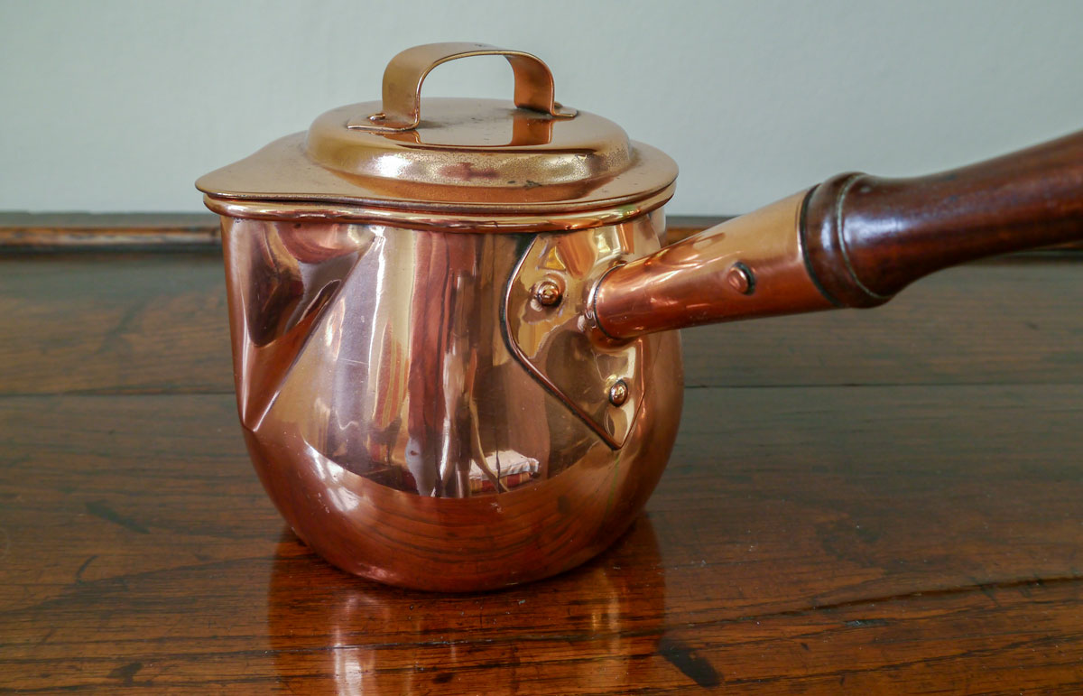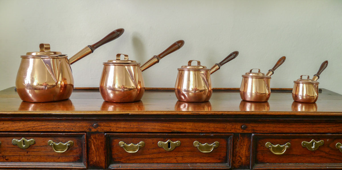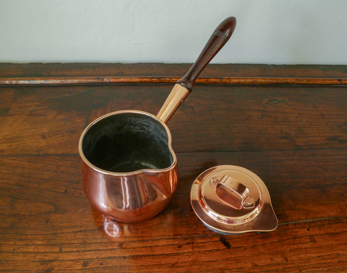 Of the highest quality – as one would expect from such highly skilled coppersmiths, these five graduated porridge pans, or brandy warmers, have the original tight-fitting lids, and turned fruitwood handles.