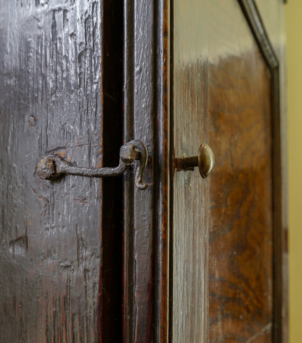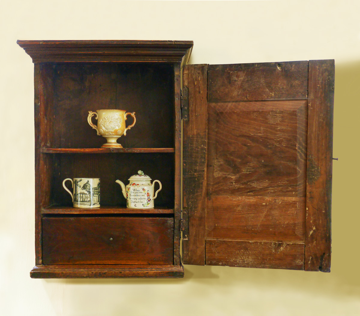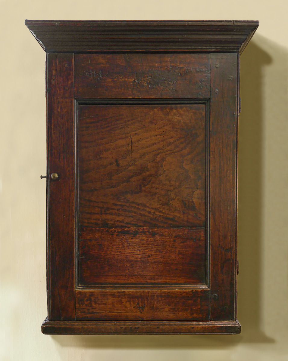 Below a deep and well-moulded cornice, is a single panel door set into a pegged mortice and tenon frame, which is hung on the original iron ‘H’ hinges. The interior has two oak shelves, and a deep horizontal drawer with a plain oak front.