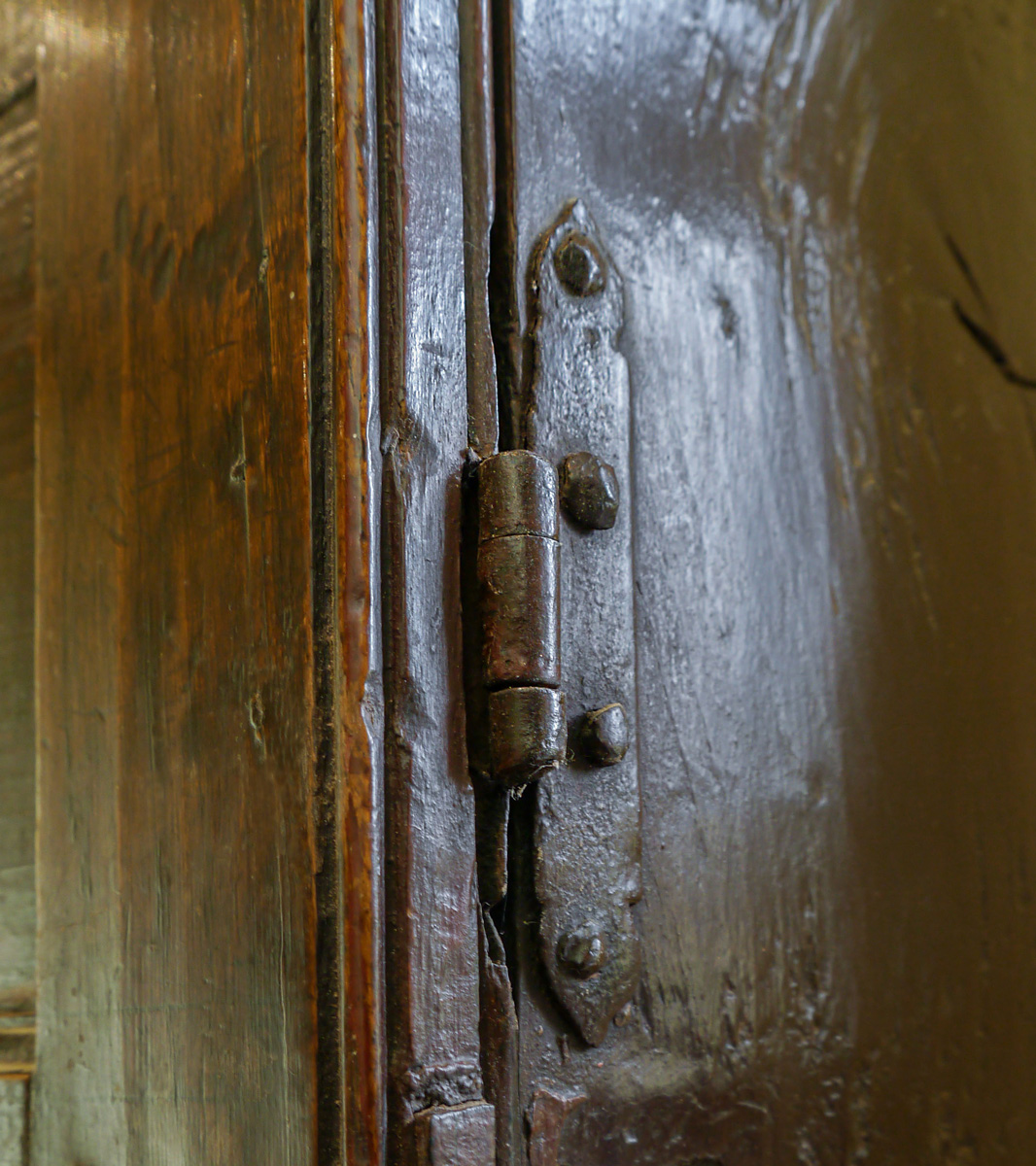 A lovely feature is the simple blacksmith-made iron hook attached to the side, which flips over an iron nail driven into the edge of the door to secure.