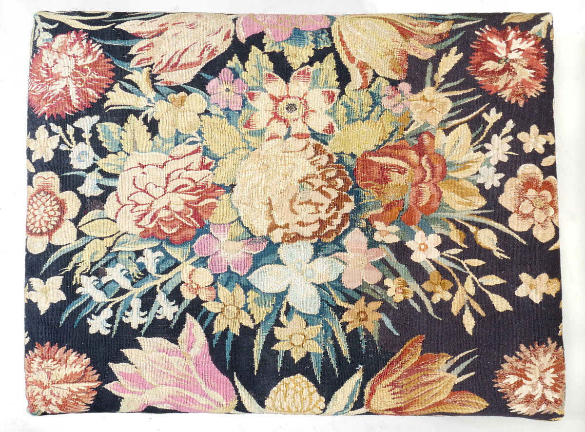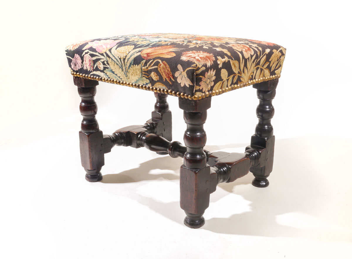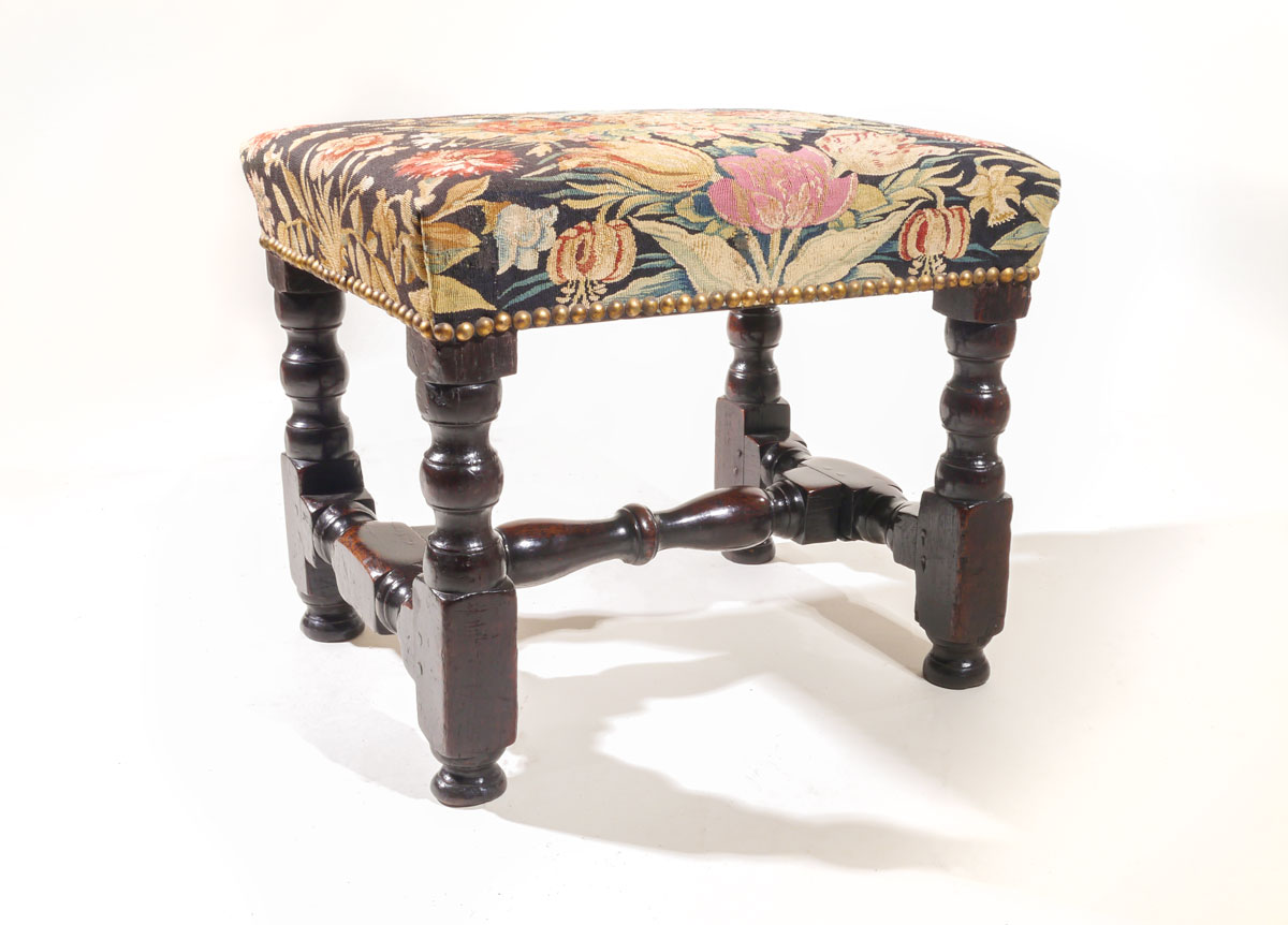 The ball turned legs, joined by an H-form stretcher, with a strongly turned baluster cross piece. The top is upholstered in a piece of late 17th century Dutch tapestry.