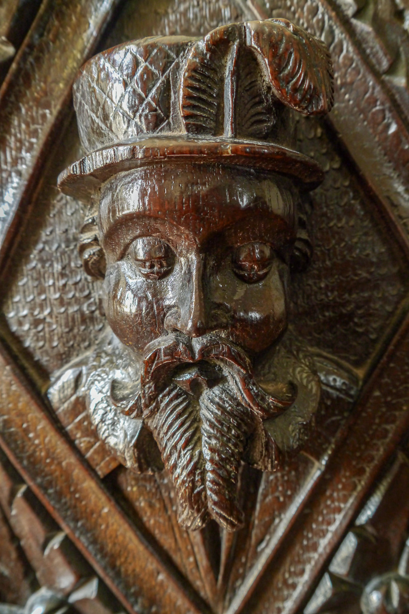 This kindly face is exquisitely carved, with fantastic detail and is integral with the background, which is embellished with tiny carved fish-like scales, which are repeated along the recessed moulding of the lozenge frame. The corners of the panel are filled with stylised oak leaves, with a central whorl.