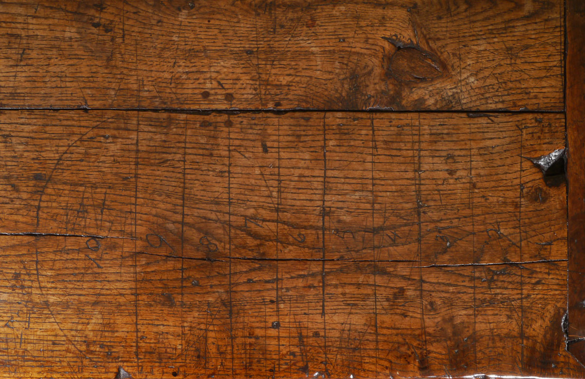 A most charismatic early 17th century table. The thick boarded top, with inset end cleats, has been marked for the game shove ha’penny, an indication that it if not made for use in a tavern, certainly spent some time in such an establishment. The four heavy baluster turned legs are joined by square stretchers around the base. Adding to the character of the piece are the iron corner brackets, which have been introduced during the 18th century to stop the frame from moving – again, an indication that it was used in an inn where the gamblers would lean over or push against the table during their games of shove ha’penny.