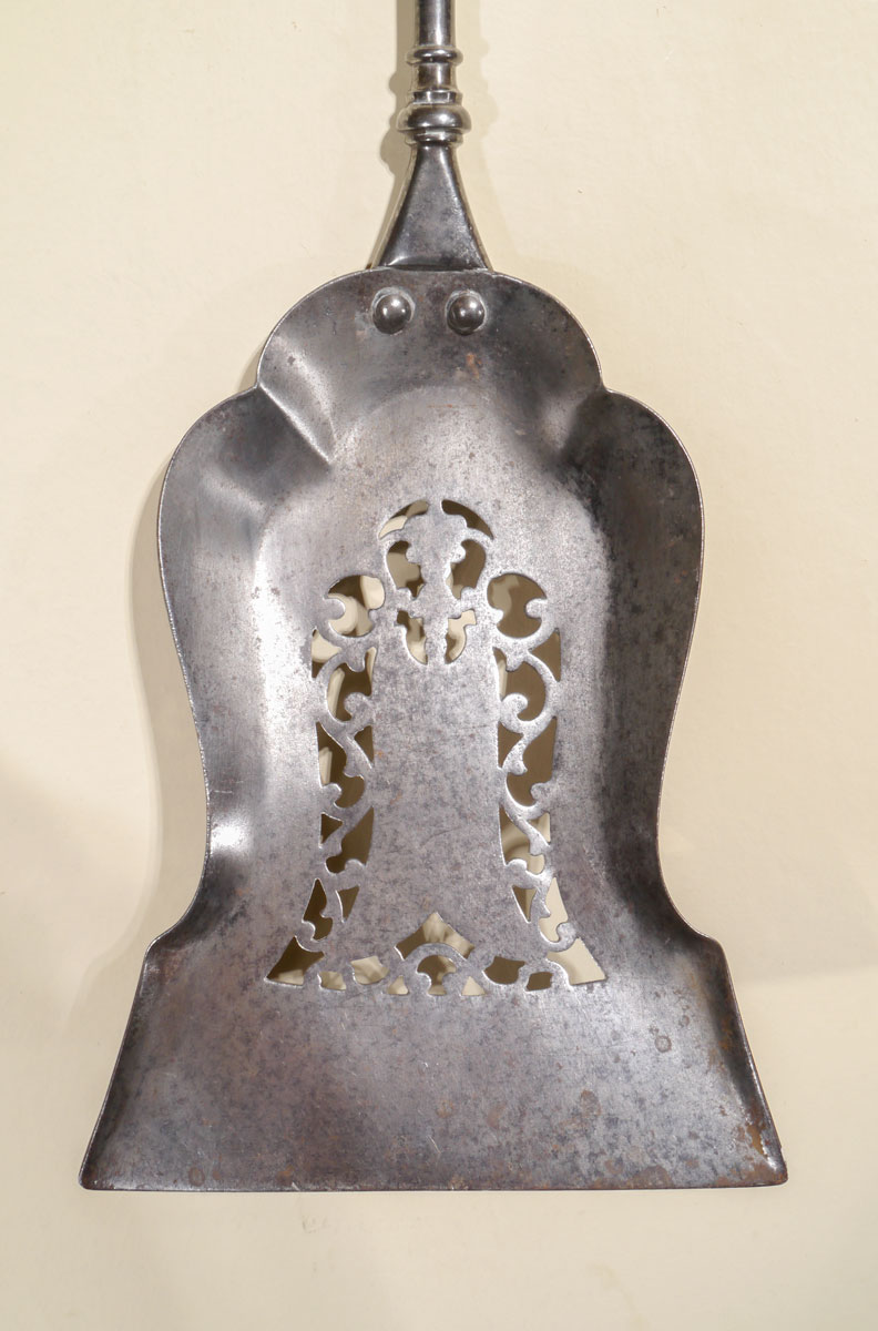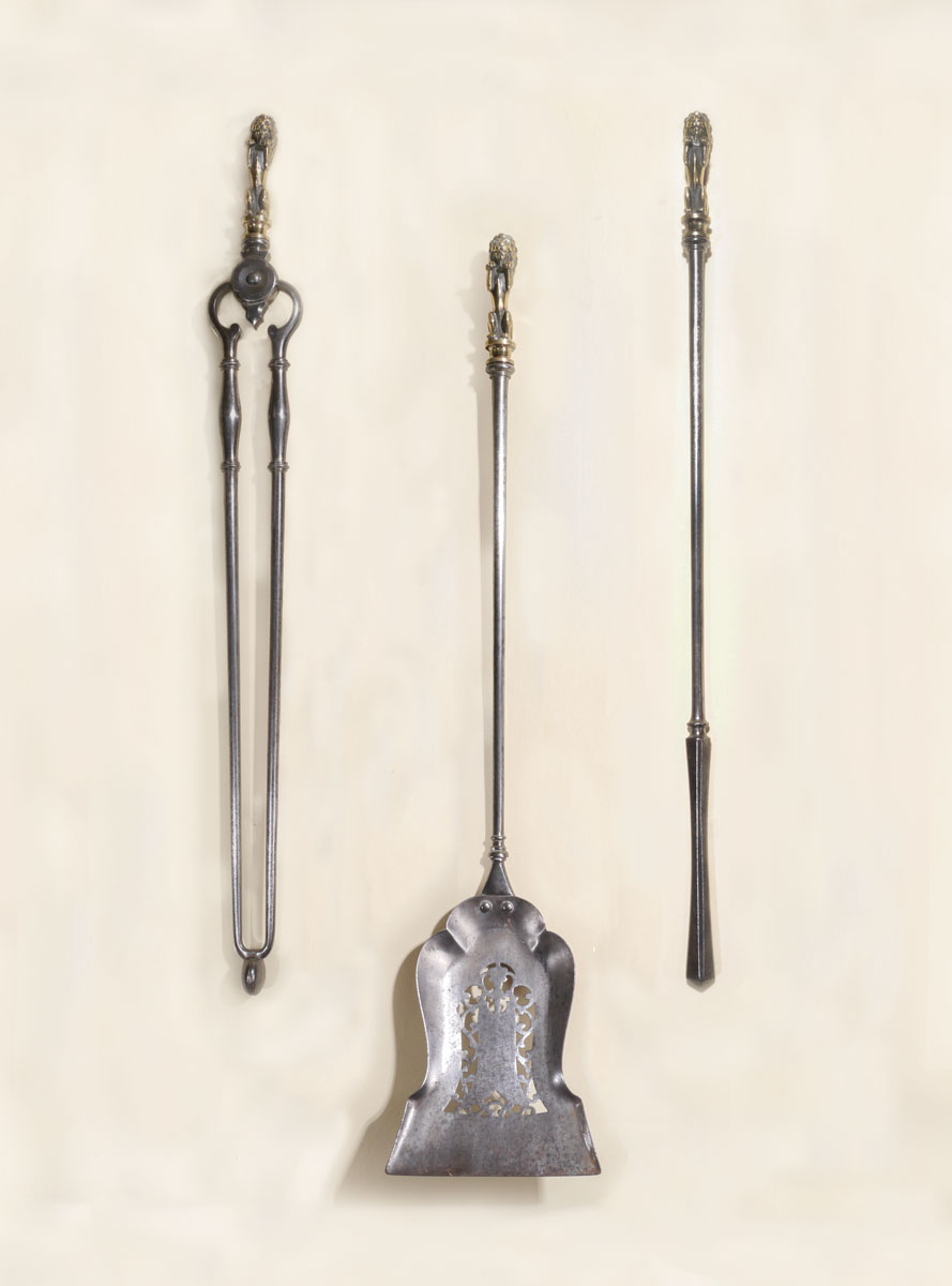 The tongs, poker and shovel constructed from heavy burnished steel, each surmounted by cast brass lion sejant finials.