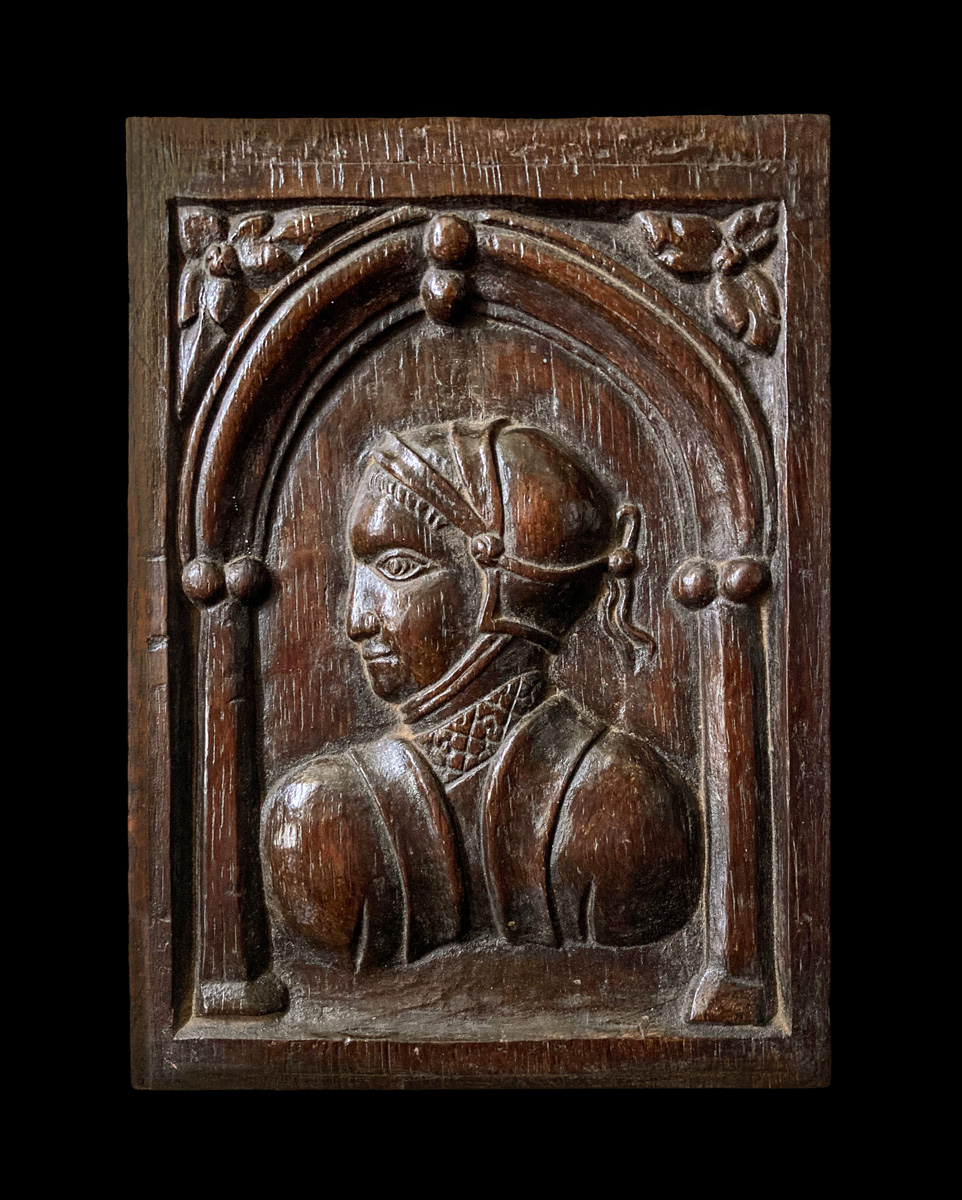 Carved with a half-portrait of a noble lady, her hair gathered within a fretted cap, or bonnet, tied at the back with ribbon in a bow. The subject has well-defined features and an elegant neck within a tall ruff collar. Her blouse has the exaggerated “padded” shoulders, the height of fashion within mid-16th century society.